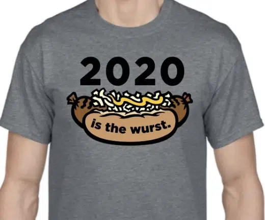 The shirts available are 2020 Bites with Timber Rattlers mascot Fang; 2020: Udder Disaster with the Wisconsin Udder Tuggers logo; and 2020 is the Wurst with the Wisconsin Brats logo.